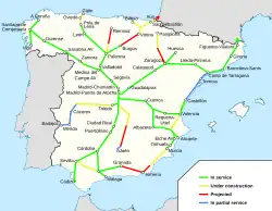 - Ferrovia ad alta velocità Madrid–Barcellona-Confine francese (Madrid, Guadalajara, Calatayud, Saragozza, Lleida, Barcellona, Confine francese), aperta fino a Barcellona dal febbraio 2008. Questa linea ha una diramazione per Huesca dopo Saragozza inaugurata nel 2003.
