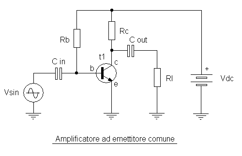 Esempio teorico di amplificatore in classe A con singolo transistor nella configurazione ad emettitore comune. Notare che l'intera onda sinusoidale viene amplificata. Nella realtà sulla base è necessario sostituire la resistenza RB con un partitore R1 R2 e mettere sull'emettitore una resistenza RE di controreazione che garantisce la stabilità del circuito alle variazioni di temperatura e dei parametri del transistore.