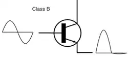 Notare che, in questo caso, una certa porzione del segnale viene amplificata da entrambi i dispositivi attivi: in questo modo si riduce enormemente la distorsione che si ha nella regione di commutazione di questi. Questa distorsione è anche nota con il nome "distorsione di incrocio" (o crossover). Il valore dell'efficienza teorica è compreso fra il 50% e il 78.5% (Classe B)