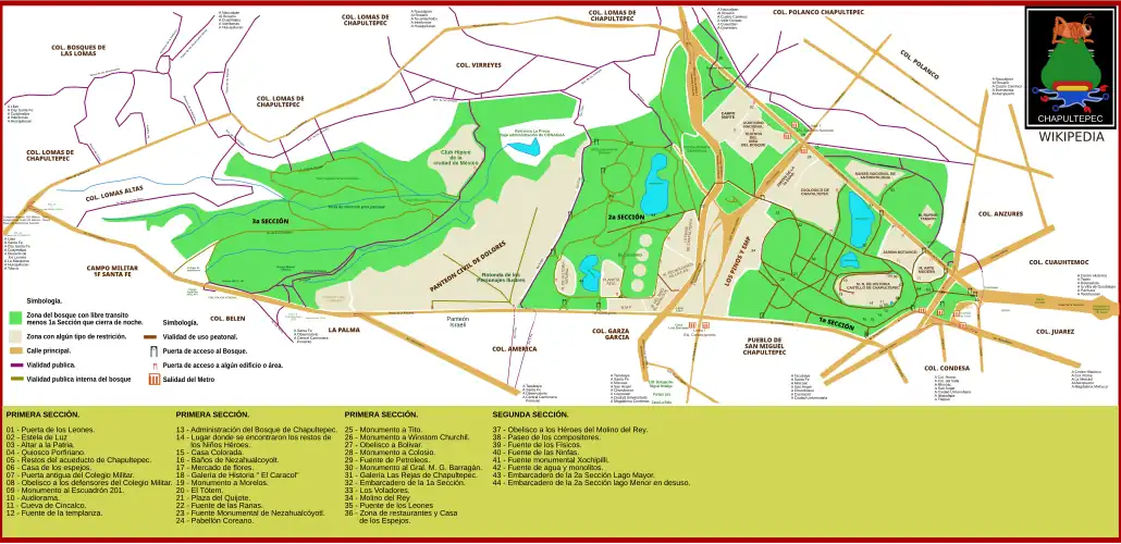 Il bosco attualmente è diviso in tre sezioni. Si può arrivare al bosco usando le stazioni della metro Chapultepec, Auditorio e Costituyentes.
