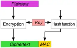 Viene spedito un messaggio cifrato contenente il messaggio originale e il suo codice MAC. Viene usato, ad esempio, nel protocollo SSL/TLS.[6] Nonostante non sia stata dimostrata una forte non-falsificabilità di questo metodo in sé,[4] l'implementazione SSL/TLS è ritenuta sicura.[7] L'approccio di quest'ultima può infatti essere descritto come MAC-then-pad-then-encrypt, ovvero è previsto un padding del testo prima della cifratura.