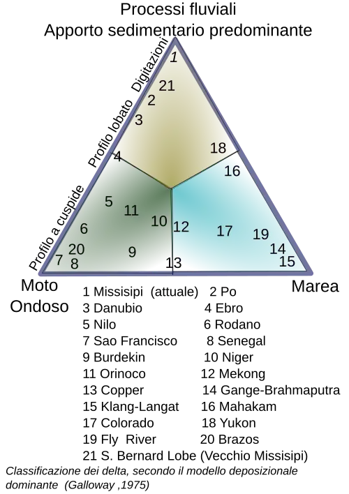 L'immagine accanto offre una panoramica delle forme assunte dagli apparati deltizi in funzione della prevalenza dei processi marini (maree, onde, correnti costiere) o dei processi fluviali (correnti fluviali). La classificazione più utilizzata per definire gli apparati deltizi è basata sull'effetto combinato di tre fattori[5]: