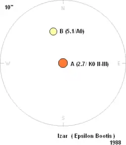 Izar è una stella binaria, composta da una luminosa gigante arancione e una più piccola stella bianca di sequenza principale di classe A2, separata dalla principale di almeno 185 U.A., con un periodo orbitale superiore ai 1000 anni.