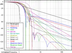 Al momento di scegliere un'appropriata funzione finestre, questo grafico di comparazione può risultare utile. Il grafico mostra solamente il dettaglio del lobo principale della risposta in frequenza della finestra. L'asse delle frequenze ha come unità i "bins" della FFT quando la finestra di lunghezza N è applicata ai dati ed una trasformazione di lunghezza N è effettuata.