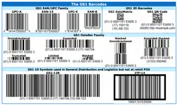 Alcuni dei codici a barre sviluppati e gestiti da GS1 sono: EAN/UPC (usati soprattutto per i beni di consumo), GS1 DataMatrix (usati soprattutto per i prodotti healthcare), GS1-128, GS1 DataBar, e GS1 QR Code.