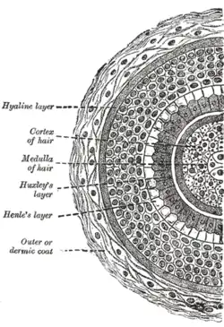La cuticola è lo strato più esterno, con uno spessore di 2-4 µm[2], formato da scaglie quadrangolari legate fra loro con un margine libero che è rivolto verso la punta del pelo. Sono queste scaglie che determinano l'irregolarità della superficie. Le scaglie sono delle lamelle cornee derivanti da cheratinociti in un modo analogo a come avviene nell'epidermide. È uno strato sottoposto ad alterazione durante la crescita del pelo e protegge gli strati sottostanti.