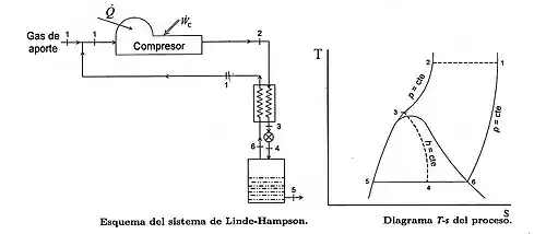 L'aria è compressa fino a pressioni piuttosto elevate, ma circa a temperatura ambiente. Viene quindi raffreddato isobaricamente in uno scambiatore di calore rigenerativo ed espansa isoentalpicamente tramite una valvola di laminazione, l'aria si raffredda per effetto Joule-Thomson.