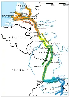 Superata Basilea, il Reno svolta verso nord e costituisce un confine storico tra Germania e Francia, scorrendo in una larga vallata prima di entrare interamente in territorio tedesco a Rheinstetten, vicino a Karlsruhe. L'ampia valle del Reno finisce alla confluenza con il Meno a Magonza. La parte fra Bingen e Coblenza, dove il Reno entra in una valle più stretta, è nota come Gola del Reno, una formazione creata dall'erosione e da un sollevamento tettonico. Questo tratto del fiume è noto per i castelli medievali e i vigneti che ricoprono le alture circostanti; nel 2002 è stato dichiarato Patrimonio dell'umanità dall'UNESCO.