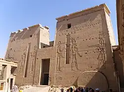 Il tempio più importante è il Tempio di Iside che, costruito in epoca tolemaica, domina l'intera isola. Una lunga via processionale conduce al 1º pilone. Su un lato si snoda il Grande colonnato con 32 colonne che, eretto in epoca più tarda, fu portato a termine da Tolomeo III. Sull'altro lato si sviluppa invece il colonnato orientale in parte danneggiato. Al termine della via processionale si erge il 1º pilone per un'altezza di circa 18 metri. L'intera facciata è decorata da bassorilievi rappresentanti il sovrano nell'atto di sconfiggere ed uccidere i nemici presi prigionieri. Le scene si svolgono alla presenza della dea Iside. Molti di questi bassorilievi sono stati mutilati, probabilmente da parte dei primi cristiani e degli iconoclasti.