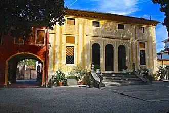 All'esterno è presente un giardino all'italiana, chiuso da un muro affrescato, decorato da una fontana centrale, numerose sculture in pietra e due barchesse porticate su due piani.