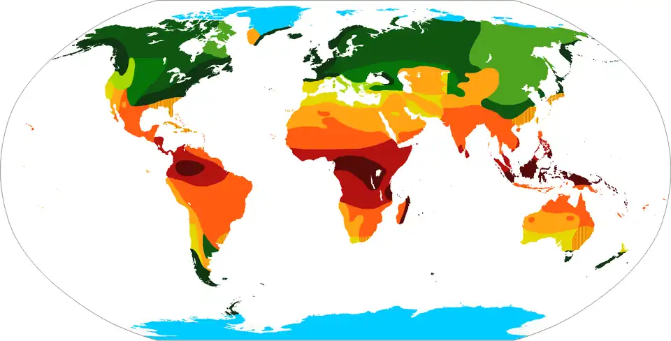 | Piogge cicloniche extratropicali piogge tutto l'anno con massimo in autunno e inverno idem, con massimo estivo piogge periodiche con massimo primaverile idem, con massimo estivo idem, con massimo in autunno-inverno idem, con massimo in inverno | Piogge convettive tropicali piogge tutto l'anno con deboli variazioni due stagioni piovose con l'altezza massima del Sole una sola stagione piovosa con l'altezza massima del Sole | piogge scarse (< 200 mm) ██ piogge convettive periodiche con massimo invernale piogge sporadiche delle regioni polari |