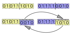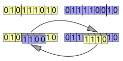 - Crossover uniforme: consiste nello scambiare casualmente dei bit tra le soluzioni candidate all'evoluzione. Si segnala l'esistenza anche di crossover uniformi parziali ossia dei crossover uniformi dove lo scambio di bit è limitato ad una percentuale fissa o dinamica dei cromosomi candidati all'evoluzione.