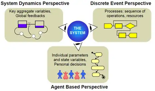 La System dynamics e il Discrete Event sono i due approcci tradizionali alla simulazione, agent based è l'ultimo nato. Tecnicamente, l'approccio attraverso la system dynamics è molto affine ai processi continui mentre il "discrete event" (termine con cui indichiamo tutti i linguaggi di programmazione discendenti da GPSS anche conosciuto come approccio di simulazione processo-centrico) e agent based lavorano prevalentemente con passo temporale discreto, i.e. saltano da un evento all'altro.