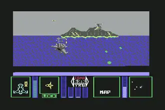 Inizia quindi l'azione del pilotaggio della navicella, mostrata in 3D da dietro mentre viaggia sopra il mare. Mentre avanza costantemente, la navicella si può spostare lateralmente muovendosi in circolo (come in un tonneau) e spara verso il centro dello schermo, in modo simile al classico Gyruss[3]. Si incrociano molti velivoli nemici che sparano a loro volta. Si dispone di munizioni e di resistenza ai colpi limitate. Due indicatori a freccia mostrano in che direzione si trova l'isola[4]; infatti con gli spostamenti laterali, oltre a schivare gli attacchi, si cambia anche la rotta, indicata da una bussola.