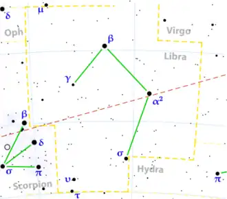- υ Librae è una stella arancione di magnitudine 3,60, distante 224 anni luce.