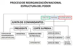 La nuova struttura di potere era guidata da una Giunta militare (Junta militar o Junta de Comandantes) costituita dai capi delle tre forze armate. La prima giunta fu formata da Jorge Rafael Videla (esercito), Orlando Ramón Agosti (aviazione), Emilio Eduardo Massera (marina). Erano coadiuvati da un Potere esecutivo (il governo ministeriale, Poder Ejecutivo Nacional, PEN) e da una Commissione di consulenza legislativa (Comision de Asesoriamento Legislativo, CAL), formata da tre rappresentanti per ogni forza armata.