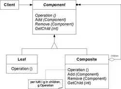 - Component: dichiara l'interfaccia per gli oggetti nella composizione, per l'accesso e la manipolazione di questi, imposta un comportamento di default per l'interfaccia comune a tutte le classi e può definire un'interfaccia per l'accesso al padre del componente e la implementa se è appropriata.