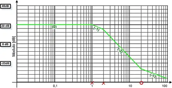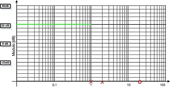 Partiamo considerando una retta con pendenza iniziale 0 e che passa per il punto iniziale 20dB (significa che nel punto di pulsazione 1 ha modulo 20dB).