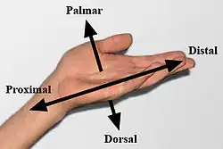 - Per le mani si utilizzano: palmare o volare e dorsale (rispettivamente anteriori e posteriori nella posizione anatomica).