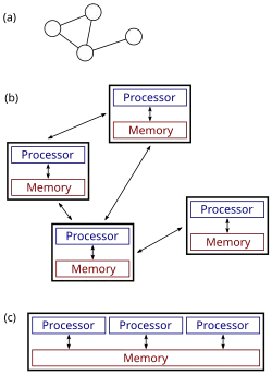 La figura (a) è la vista schematica di un tipico sistema distribuito: il sistema è rappresentato come un grafo in cui ogni nodo (vertex) è un computer ed ogni riga (linea tra due nodi) è un collegamento di comunicazione. La figura (b) mostra lo stesso sistema distribuito più in dettaglio: ogni computer ha la propria memoria locale, e le informazioni possono essere scambiate solamente grazie al passaggio di messaggi da un nodo ad un altro usando i nodi di comunicazione disponibili. La figura (c) mostra un sistema parallelo in cui ogni processore ha accesso diretto alla memoria condivisa.