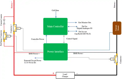 Il collegamento ai carichi è normalmente controllato tramite relè elettromagnetici chiamati contattori. Il circuito di precarica può essere costituito da resistori di potenza collegati in serie ai carichi fino a quando i condensatori non sono carichi. In alternativa, è possibile utilizzare un alimentatore switching (o switched-mode power supply) collegato in parallelo ai carichi per caricare la tensione del circuito di carico fino a un livello sufficientemente vicino alla tensione della batteria per consentire la chiusura dei contattori tra batteria e circuito di carico. Un BMS può disporre di un circuito in grado di verificare se un relè è già chiuso prima della precarica (ad esempio a causa della saldatura) per evitare che si verifichino correnti di spunto.