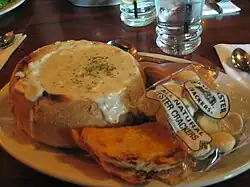 - La zuppa di molluschi viene talvolta servita in ciotole di pane a lievitazione naturale, soprattutto a San Francisco, dove il pane a lievitazione naturale è popolare tra i turisti ed è stato considerato un piatto d'autore dal 1849.