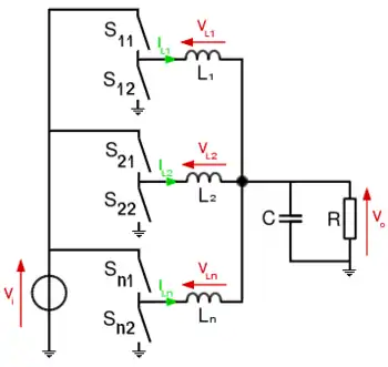 Il vantaggio primario di questo tipo di convertitore è che la corrente di carico viene divisa tra le n-fasi del convertitore. Questa separazione del carico permette di distribuire la potenza dissipata su tutti su commutatori in un'area più estesa. Un altro vantaggio ugualmente importante fornito da questo convertitore è che il "ripple" di uscita viene diviso per il numero di fasi, n. Il carico quindi viene sottoposto ad una frequenza di ripple che è n-volte la frequenza di commutazione[1].
