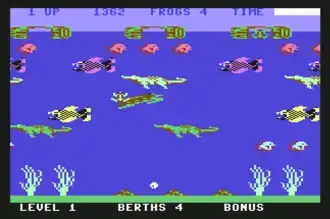 - Superficie: altri animali acquatici e tronchi attraversano l'area e sono presenti anche ninfee ferme. La tana in questo caso è un salvagente trainato da una barca. Qui la rana deve necessariamente passare sopra qualcosa di solido; se si cade in acqua si torna in fondo alla prima schermata. Mamma anatra, in particolare, è ostile quando la rana cammina sulle anatrine, altrimenti è l'unico mezzo di trasporto per la schermata successiva.