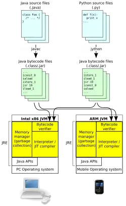 Il codice sorgente di Java viene compilato in bytecode e memorizzato in file con estensione .class. Per compilare tale codice viene fornito uno strumento che prende il nome di Javac. Questo strumento non viene considerato come un compilatore tradizionale proprio perché traduce il codice sorgente in bytecode. Il codice, a causa del formato, non può essere eseguito direttamente ma deve essere interpretato su ciascun computer. L'estrema portabilità e flessibilità del codice Java sono date, appunto, da questo passaggio intermedio.