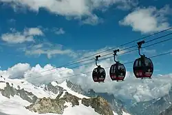 - La funivia dei Ghiacciai attraversa in tre tratte il massiccio del Monte Bianco da Courmayeur in Italia a Chamonix in Francia. Ha una lunghezza totale di 15 km e raggiunge la quota di 3 778 m.