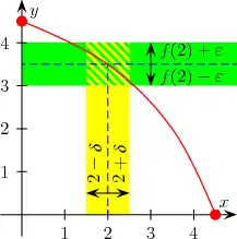 Una funzione definita su un sottoinsieme dei numeri reali a valori reali si dice continua in un punto se per ogni numero , arbitrariamente piccolo, esiste un secondo numero tale che, , la funzione dista da per meno di , ovvero:[1]