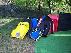 Successivamente fu introdotto l'omonimo galleggiante (simile a un piccolo bob) con la duplice funzione di proteggere l'atleta dagli urti contro le rocce e offrire un punto d'appoggio. Per proteggersi dal freddo delle acque, che in genere sono frutto del disgelo estivo di nevai e ghiacciai, la muta in neoprene è molto spessa (5 mm) e fornita di imbottiture protettive. Completano l'attrezzatura il casco, il giubbotto salvagente e le pinne, indispensabili queste ultime per dare la giusta propulsione ed affrontare i vari passaggi.