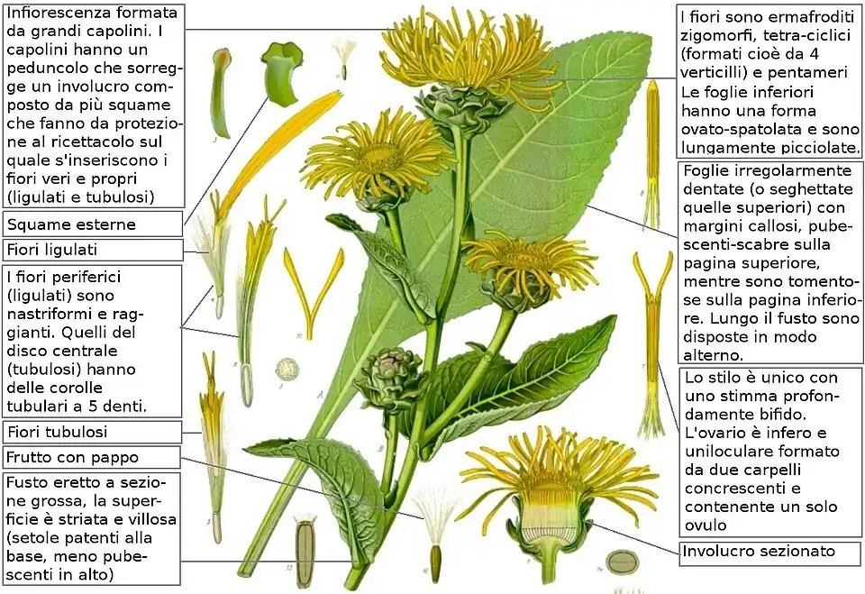 - Sostanze presenti: piccole quantità di olio etereo insieme con 1 – 3% di sostanza cristallina (questa è l'essenza dell'Inula). Sono presenti inoltre alte percentuali (19 - 45%) di inulina[3]. Alcune sostanze di questa pianta (come i lattoni sesquiterpenici) possono causare dermatiti allergiche da contatto; elevate quantità di queste sostanze possono causare vomito e diarrea.