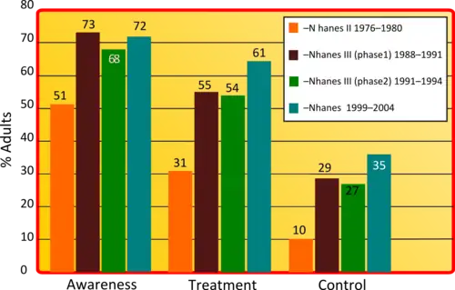 - ^ Burt VL, Cutler JA, Higgins M, MJ Horan, D Labarthe, P Whelton, C Brown e EJ Roccella, Trends in the prevalence, awareness, treatment, and control of hypertension in the adult US population. Data from the health examination surveys, 1960 to 1991, in Hypertension, vol. 26, n. 1, luglio 1995, pp. 60-9, DOI:10.1161/01.HYP.26.1.60, PMID 7607734. URL consultato il 5 giugno 2009 (archiviato dall'url originale il 20 dicembre 2012).