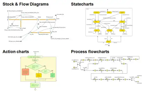 - Action charts sono usate per definire algoritmi. Possono essere utilizzate in Discrete Event, e.g. per le logiche di come instradare una chiamata in un call-center, o ad agenti (ABM), e.g. per le logiche di decisione di un agente.