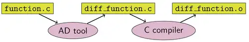 Il codice sorgente di una funzione è sostituito con il codice, generato automaticamente, di una funzione che interlaccia le istruzioni originarie con le istruzioni aggiuntive per il calcolo delle derivate. Tale approccio può essere implementato in ogni linguaggio, e rende possibile un maggior numero di ottimizzazioni automatiche da parte del compilatore, tuttavia l'implementazione dello strumento di generazione automatica è abbastanza complesso.