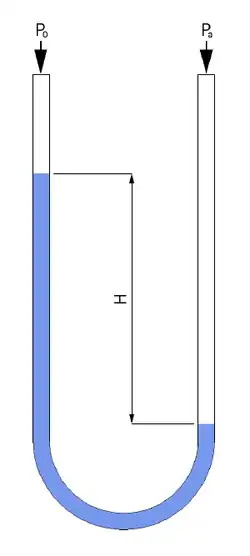 Sono costituiti da un tubo (di solito trasparente) curvato ad U e riempito di un liquido di densità nota. Un'estremità del tubo è lasciata aperta all'atmosfera, mentre l'altra è in collegamento diretto con l'ambiente di misura. Il liquido contenuto nel tubo si sposterà verso l'alto in uno dei due rami della U di un valore tale che la differenza di peso tra le due colonne di liquido bilanci esattamente la pressione (o depressione) presente nell'ambiente di misura. Per i serbatoi ad acqua spesso si usa il mercurio con = 133000 N/m³. Si veda la figura 1 per uno schema. Se si esprimono i valori in unità coerenti, si avrà:[3][4][5]
