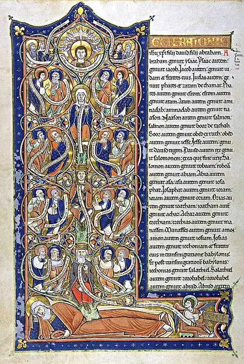 Matteo apre il proprio vangelo con la genealogia di Gesù, divisa in 14 generazioni: da Abramo a David, da David all'esilio babilonese e quindi sino a Giuseppe, padre putativo di Gesù. L'elenco si apre e si conclude con il titolo di "Cristo" abbinato alla figura di Gesù (1,1, 1,18; raramente usato nel vangelo di Matteo).[1] Le parole di apertura del vangelo mostrano che egli fu scritto da un ebreo per un pubblico di tradizione e cultura ebraica.[2] La genealogia dimostra che Gesù ha origine dal seme di Abramo ed appartiene alla Casa di David, e quindi ne è l'erede. Il vangelo di Matteo asserisce inoltre che egli è il Figlio di Dio e, pertanto, Giuseppe non è il suo padre naturale, ma piuttosto egli ne è il padre putativo. Ra McLaughlin ha notato come significativa l'adozione di Gesù da parte di Giuseppe (con il dare il nome al bambino, come farebbe un vero padre naturale) che rende Gesù il messia predetto nella linea di David.[3]