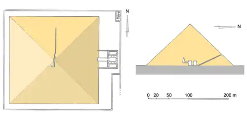 I visitatori possono accedere all'edificio per mezzo di un'entrata sulla parete nord. Un passaggio, alto meno di un metro e largo 1,2 m, discende nel cuore della piramide per una sessantina di metri, fino ad incrociare un breve corridoio che conduce ad una camera dalle pareti progressivamente aggettanti verso l'alto (falsa volta) alte 12,2 m. All'estremità meridionale della camera, un altro passaggio porta alla seconda camera.
