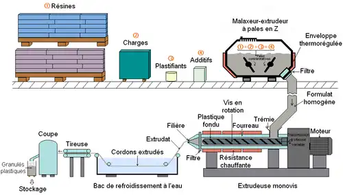 Alla base polimerica vengono aggiunte svariate sostanze ausiliarie ("cariche", additivi e plastificanti) in funzione dell'applicazione cui la materia plastica è destinata. Possono essere plastificanti, coloranti, antiossidanti, lubrificanti ed altri componenti speciali.