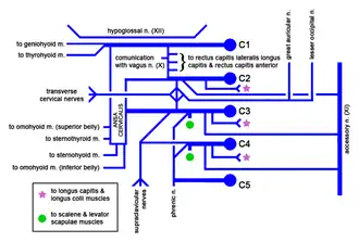 - Nervi per i muscoli sternocleidomastoideo e trapezio: si portano ad innervare i rispettivi muscoli, sternocleidomastoideo e trapezio. Essi originano dal 2º e dal 3º ramo cervicale.