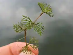 Le foglie di questa pianta sono tutte del tipo lacinie capillari piuttosto rigide e separate una dall'altra (non si riuniscono a pennello se estratte dall'acqua). Le lacinie sono inoltre tutte disposte su un unico piano. Lunghezza delle lacinie: 1 – 2 cm.