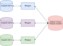 Si consideri una applicazione web in cui un utente può richiedere una varietà di informazioni sulle città (come statistiche sulla criminalità, meteo, alberghi, demografia, ecc.). Tradizionalmente, le informazioni devono essere memorizzate in un unico database con un singolo schema. Ma ogni singola impresa avrebbe trovato difficile e costoso raccogliere informazioni con tale estensione. Anche se le risorse esistono per raccogliere dati, avrebbero duplicato i dati nei database criminologici, siti web meteorologici e dati di censimento esistenti. Una soluzione di integrazione può affrontare questo problema considerando le risorse esterne come viste materializzate su uno schema virtuale mediato, con conseguente "integrazione dei dati virtuale". Ciò significa che gli sviluppatori dell'applicazione costruiscano uno schema virtuale — lo schema mediato — per meglio modellare il tipo di risposte che i loro utenti desiderano. Successivamente, essi progettano wrapper o adapter per ogni sorgente di dati, come il database criminologico e il sito meteorologico. Questi adapter semplicemente trasformano i risultati delle query locali (quelli restituiti dai rispettivi siti o database) in una forma facilmente elaborata per la soluzione integrata. Quando un utente interroga lo schema mediato, la soluzione integrata trasforma la query in un'appropriata query sulle rispettive sorgenti di dati. Infine, il database virtuale raggruppa i risultati di quelle query nella risposta alla query dell'utente.