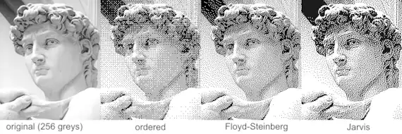 - Dithering ordinato (Ordered dithering): produce un risultato simile a quello ottenuto nella stampa delle riviste attraverso l'uso dell'halftone