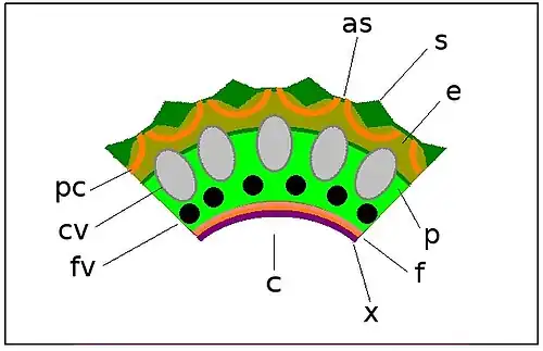 - Sezione trasversale di un tipico fusto di “equiseto” (figura a sinistra) in corrispondenza di un internodo: la parte più esterna consiste in una epidermide (e) contenente diversi granuli di silice (da qui le proprietà meccaniche tipo taglio o abrasione di queste piante). In corrispondenza delle costole longitudinali del fusto il tessuto vegetale (chiamato cordone sclerenchimatico) è ulteriormente ispessito (s). Nelle “vallecole”, avvallamenti tra una costola e l'altra dove l'ispessimento è minore, è presente il parenchima clorofilliano (pc), questo solamente nei fusti sterili. In questa zona sono presenti anche gli stomi, delle aperture stomatiche (as) la cui funzione è di consentire lo scambio gassoso fra interno ed esterno del vegetale, in particolare la fuoriuscita di vapore acqueo e l'entrata di ossigeno e di anidride carbonica. Nelle specie europee gli stomi sono più superficiali (come nel presente disegno), mentre in quelle tropicali sono più interni. Ancora più internamente, immersi nel parenchima (p), abbiamo i canali vallecolari (cv), probabilmente la loro funzione è di facilitare la circolazione dell'aria in tutta la pianta, e i fasci cribro-vascolari (fv), altre strutture di tipo “eustelico” (derivate dalla “sinfostele” centrale interrotta in più punti) conduttrici di sostanze liquide. Questa struttura (“eustelica”) è tipica della zona internodale e meno evidente in quella nodale. Al centro è presente una grande cavità vuota (c) che nel rizoma e nei rametti laterali serve a contenere il midollo. Questa cavità è circondata dal xilema (x) che a sua volta è circondato dal floema (f).[1][2].