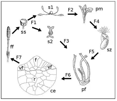 La oosfera (gamete femminile contenuto nell'archegonio) a questo punto attende la fecondazione da parte di un spermatozoide (o gamete maschile cigliato prodotto dall'anteride giunto a maturità) [F5]: potrà finalmente svilupparsi il nuovo sporofito [F7] (ossia altri fusti di “equiseto”) passando per la cellula embrione [F6].[1][2].