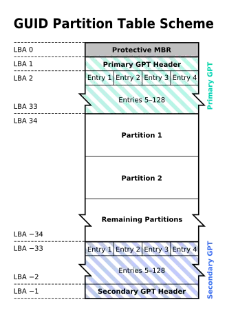Diagramma dello schema GUID Partition Table. Ogni blocco logico (logical block in inglese) (LBA) ha una dimensione di 512 byte. Indirizzi negativi di LBA indicano le posizioni dalla fine del disco, essendo −1 l'ultimo blocco indirizzabile.