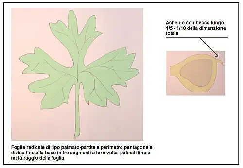 - Foglie basali: le foglie basali sono picciolate, pubescenti ed hanno una forma palmato-partita con un contorno pentagonale. I vari segmenti (3) sono divisi in modo completo fino alla base e sono a loro volta lobati fino a metà della lunghezza del raggio della foglia. Dimensione del picciolo: 3 – 10 cm.