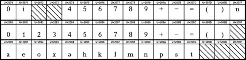Contiene cifre, lettere e simboli in apice e pedice. Basato sugli standard ISO 2375 e ISO 2022, nel blocco sono assenti i numeri 1, 2 e 3 in apice poiché presenti in Latin-1 Supplement, in accordo con ISO/IEC 8859-1.