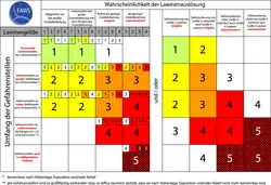 In molte località viene utilizzata una scala europea per rappresentare il rischio di distacco di valanghe in quel momento nei pressi della località stessa, ed è quindi utile e auspicabile la consultazione in sito da parte degli alpinisti/scialpinisti che vogliano intraprendere un'escursione fuoripista. I gradi di rischio sono i seguenti (a ogni livello è associato il colore di una bandiera):